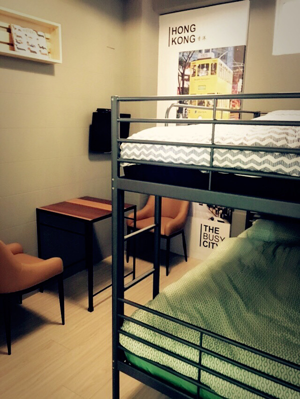 小香港房型為雙人房,採單人上下舖的形式,房間內有冰箱、電視、雙人桌椅、冷氣等設備。